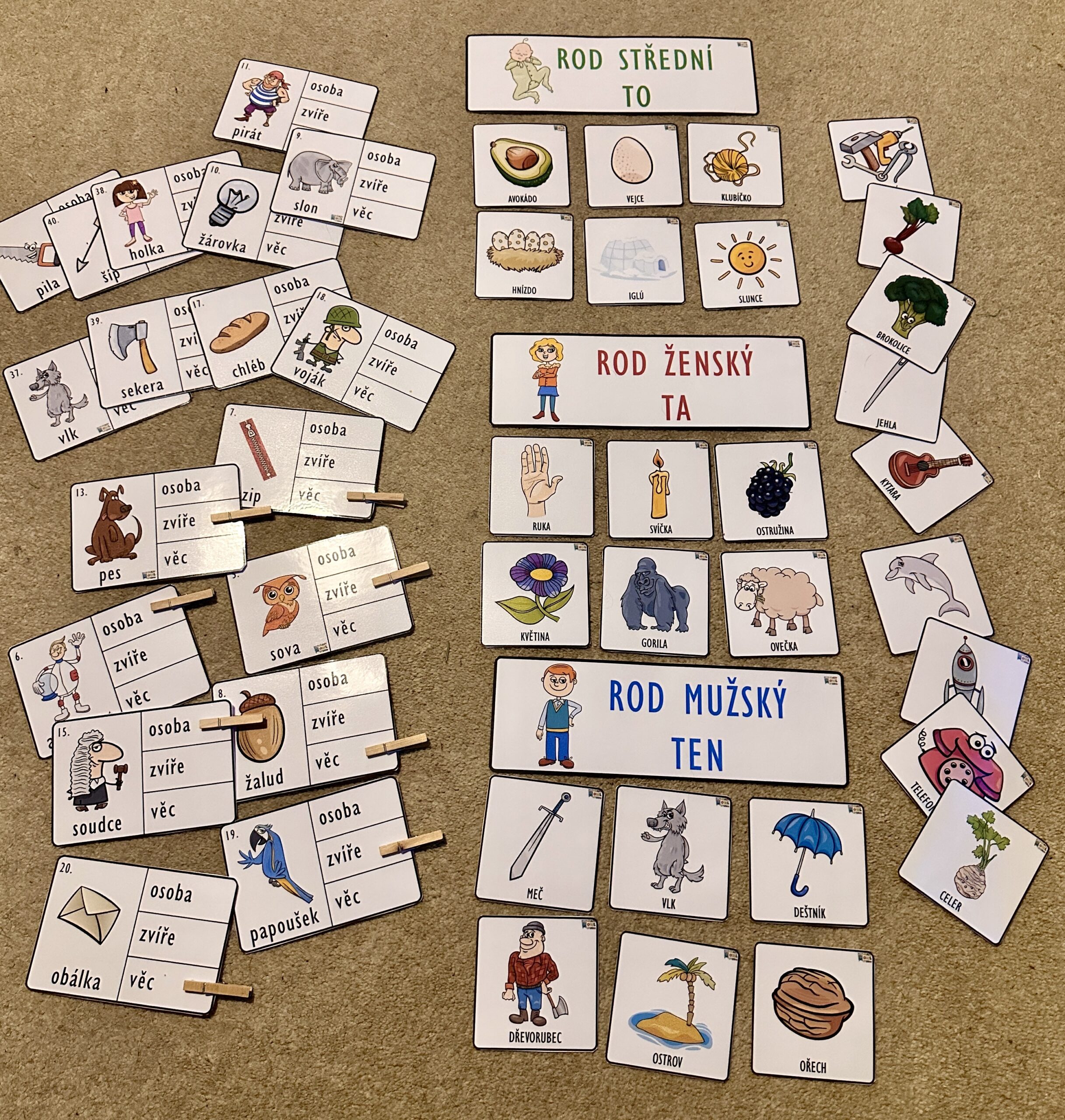 Kolíčkové kartičky k rozlišení podstatných jmen – osoba, zvíře, věc.
